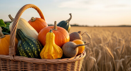 Wicker basket overflowing with autumn harvest: pumpkins, squash, beets.  Golden hour light, field background showcases abundance and fall season