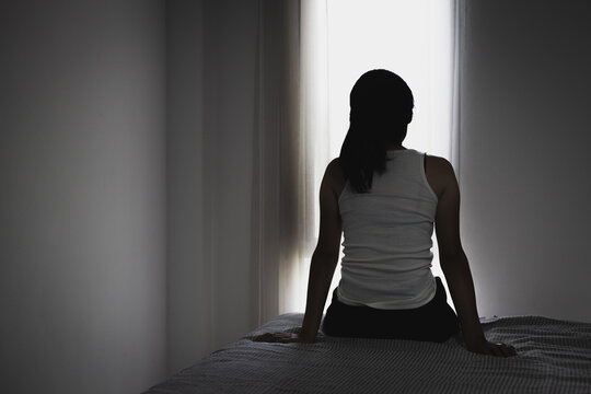 Silhouette of Young women sitting in dark room feeling pain with life problem. suffering from husband violence, Stop violence against and sexual abuse women, domestic violence, anti human trafficking.