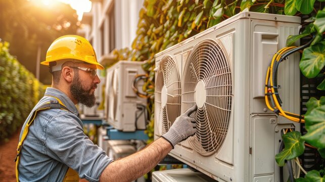 Air Conditioning Repair, repairman on the rooftop fixing air conditioning system.