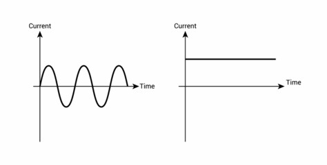 Vector graph or chart of direct current and alternating current isolated on white background. Direct current – voltage is constant. Alternating current – voltage periodically changes. Electricity flow