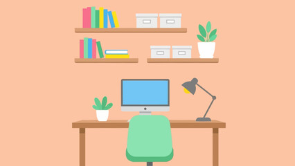 Minimalist Home Office Setup with Computer, Chair, and Shelves