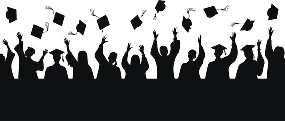 Graduation celebration, students silhouette, cap toss, academic success, ceremony moment, graduate group, education milestone, vector illustration, joy, achievement