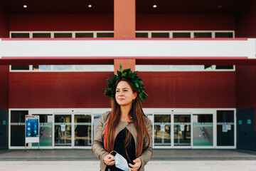 Template sketch image composite collage of knowledge academic education success study intelligent hand hold small size man stand back
