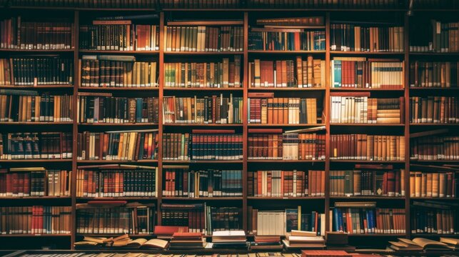 The background is large wooden bookshelves full of books on wall in the library. Knowledge archives