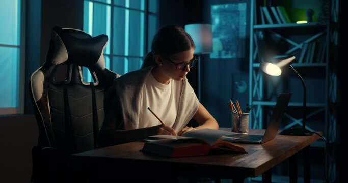Young caucasian teenage girl using laptop, studying doing school lessons late at night. College student browsing internet, searching information, writing notes.
