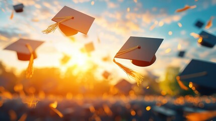 Jubilant graduation caps soar high amidst a radiant golden light, symbolizing academic achievement, future success, and the bright beginnings of a new chapter in life