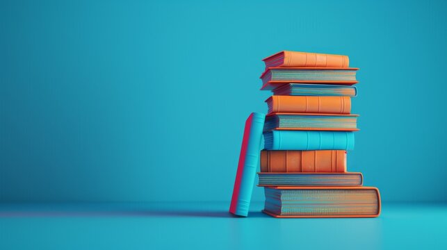 A stack of colorful books against a blue background.  A single pencil lies next to the stack.  The image represents education, knowledge, and learning.