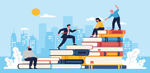 Empowering professional growth through continuous learning and collaborative support, symbolizing career advancement and educational journeys in a dynamic urban landscape