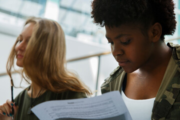 Young scholar engaged in academic coaching while studying in a modern library with a laptop nearby and books on the table