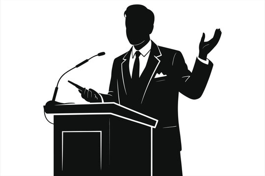 Silhouette of professor giving lecture at podium, academic speaker presenting with microphone, university teacher, public speaking, education seminar, conference, black and white vector illustration