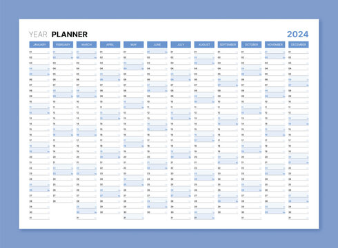 2025 year planner, blank blue annual wall calendar for daily agenda. Schedule page journal, stationery calendar, organizer, planner template with space for personal notes vector illustration