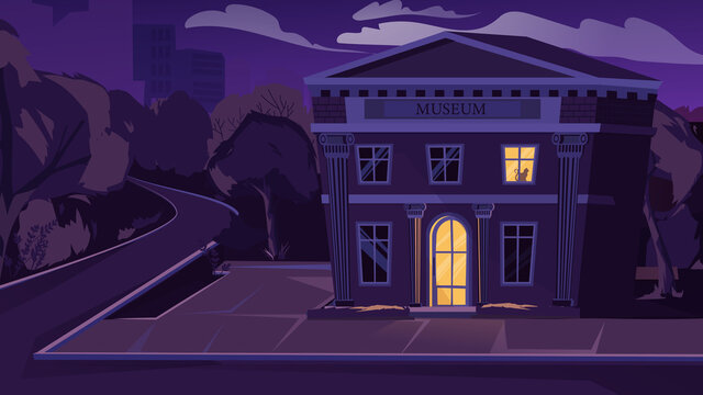 Museum at night exterior concept in flat cartoon design. Building of museum on evening street, light in entrance and window. Cityscape view with municipal institution. Vector illustration background
