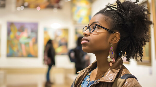 A student is immersed in viewing art in a gallery, wearing glasses and earrings, surrounded by other visitors. Artistic and educational experience