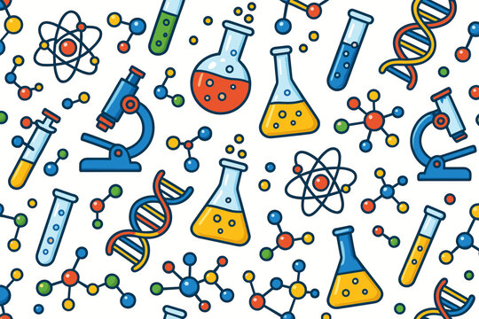 Colorful science-themed design featuring laboratory equipment and molecular structures in a playful layout