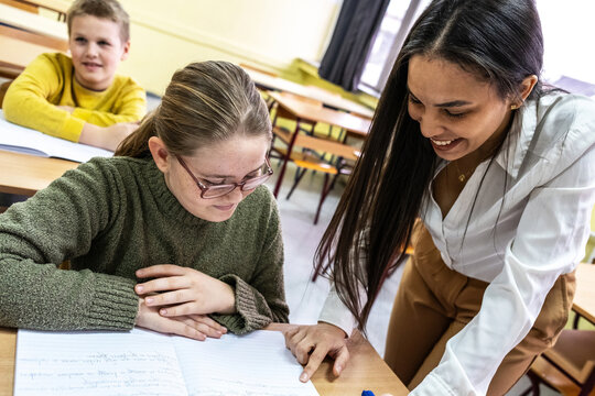 The teacher is looking over one student’s homework, giving calm guidance while checking their work. The classroom feels focused as the student waits for feedback.