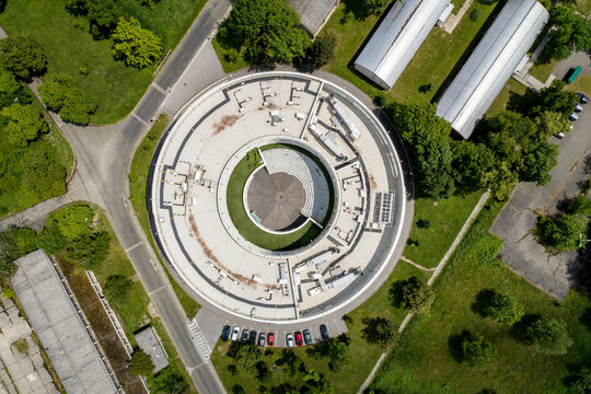 Aerial view of university science campus construction site featuring modern architecture and circular building surrounded by greenery, Zagreb, Croatia.