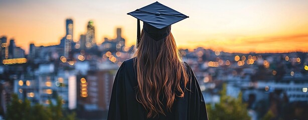 Proud Graduate Overlooking Vibrant City Skyline at Sunset Celebrating Accomplishment and Future Opportunities