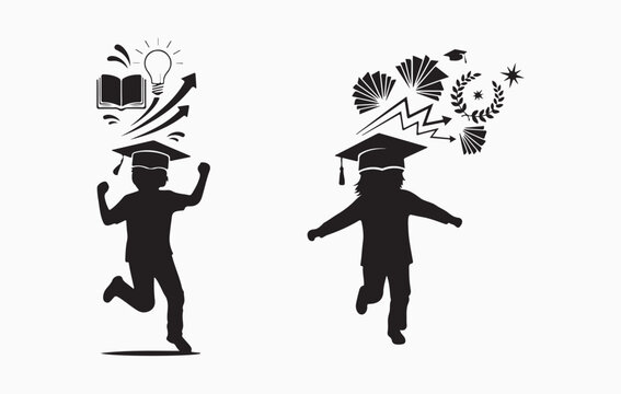 Joyful graduation celebration two students silhouette jumping excitedly with symbols of learning and growth