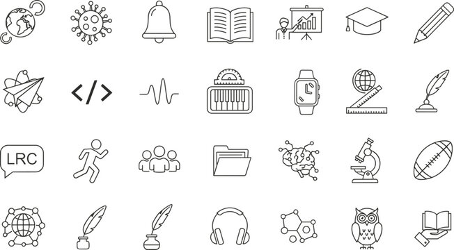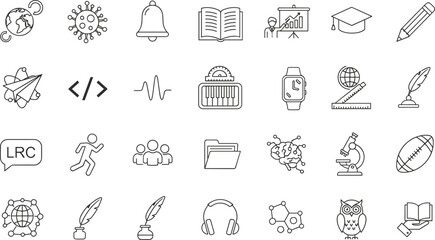 Set of 16 black line icons for education, organization, and academic productivity, ideal for vector illustration content