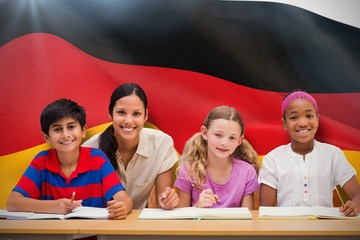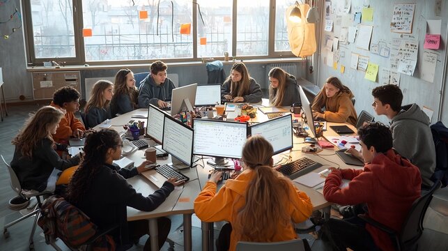 Diverse group of students working together on a computer based academic assignment in a warm cozy and inviting vintage style classroom setting with expressive brushwork and lighting