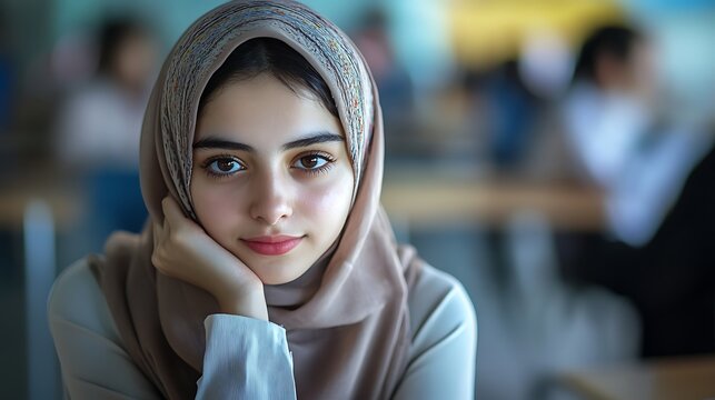 muslim female teenage pupil in classroom portrait back to school confident student smiling cultural representation education diversity academic identity and lifestyle focus