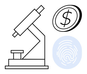 Microscope for research, coin with dollar sign for financial evaluation, and fingerprint for identity and security. Ideal for science, finance, biometrics, security, analysis, innovation