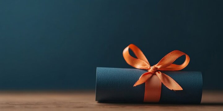 Minimalist Academic Achievement Art Rolled Diploma with Ribbon on Wooden Surface - Modern Educational Marketing and Certificate Presentation