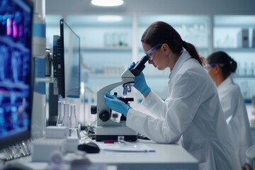 Research team of scientists examining samples under microscopes in a modern laboratory setting