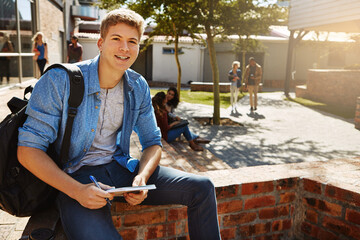 Smile, notebook and portrait of man at university in city with confidence for education, learning or campus. Scholarship, study and male student with pride outdoor at college for academic institution