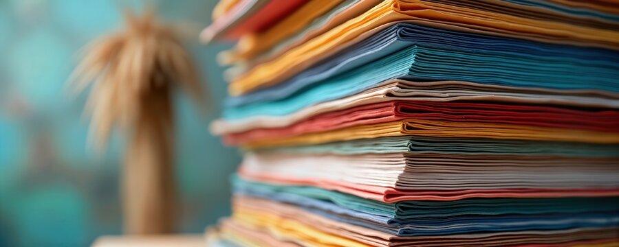 Stacked colorful papers represent compilation of research documents. Collection of scholarly articles, journal papers. Papers in different colors, form high stack. Documents look like academic