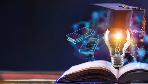 A glowing light bulb atop an open book, symbolizing knowledge and education, with a graduation cap suggesting academic achievement.