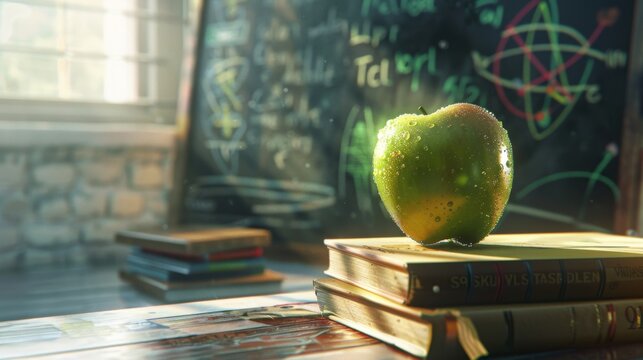 Adorable cartoon owl on stack of books, chalkboard background with math equations, back-to-school theme, perfect for educational content, classrooms, and children's materials.