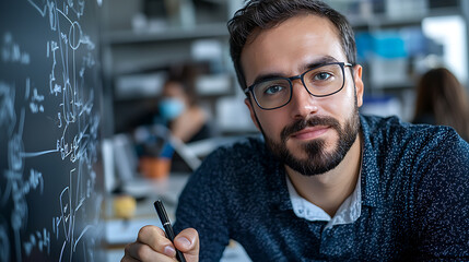 Smiling teacher adjusts glasses in sunlit classroom with math equations in background