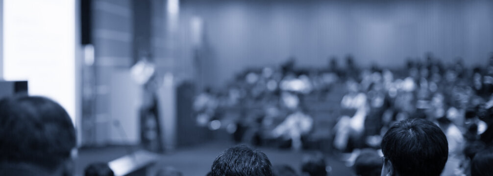 Blurred background of the business conference a group of people on the stage presentation of the project public talk High quality banner with copy space : Generative AI. High quality