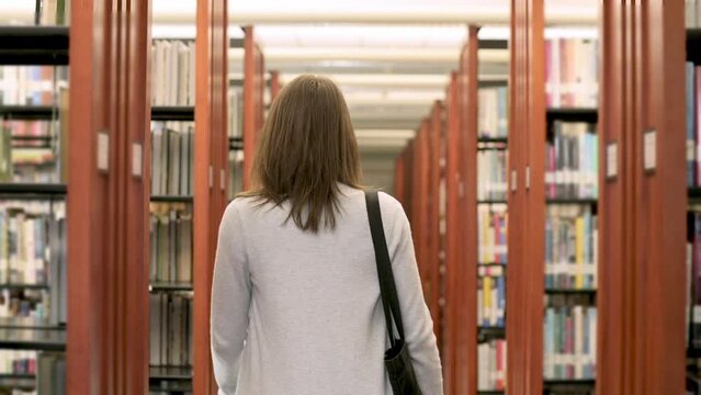 A student is depicted from behind as she walks down an aisle surrounded by towering shelves of books in a university library, symbolizing the pursuit of knowledge and the extensive academic resources