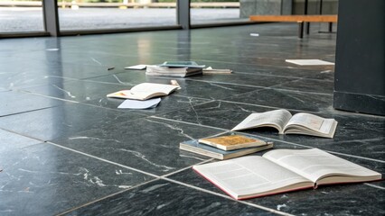 Dark grey marble floor with scattered books and papers, abstract background, academic setting, intellectual pursuits