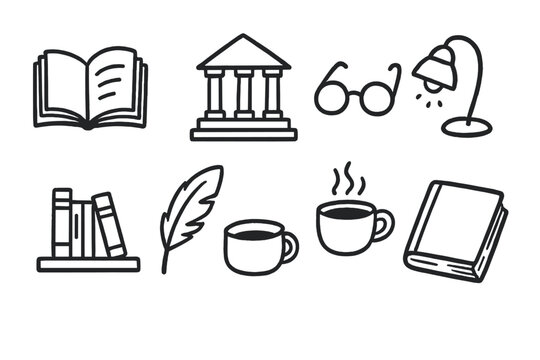 Symbols of Academic Pursuits: A collection of educational icons, including stacked books, a ruler, documents and pens, and writing materials.
