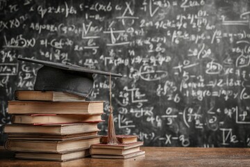 A wooden-framed blackboard showcasing numerous mathematical equations, geometric shapes, and scientific symbols, reflecting an environment of academic rigor and study.