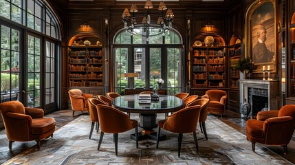Elegant traditional library room with a round table, leather chairs, bookshelves, and a fireplace, conveying a luxurious, academic atmosphere.
