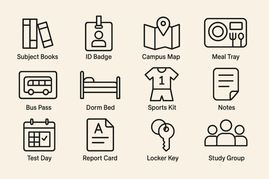 Essential school icons: books, id badge, campus map, meal tray, bus pass, dorm bed, sports kit, notes, test day, report card, locker key, study group