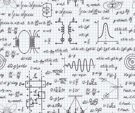 Physical vector seamless pattern with formulas, equations and figures, handwritten on a squared sheet of notebook