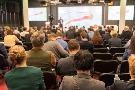 Speaker giving a talk in conference hall at business event. Rear view of unrecognizable people in audience at the conference hall. Business and entrepreneurship concept