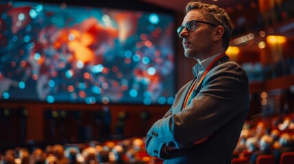 A professor presenting at an international academic conference focus on presentation, global theme, vibrant, multilayer, conference hall backdrop