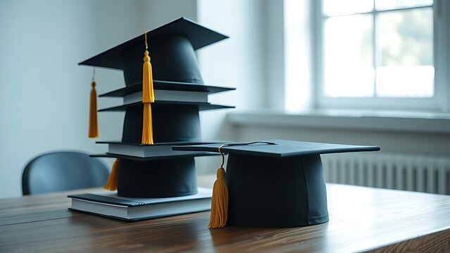 Stacked graduation hats on a wooden table, softly lit by natural window light in an academic setting.