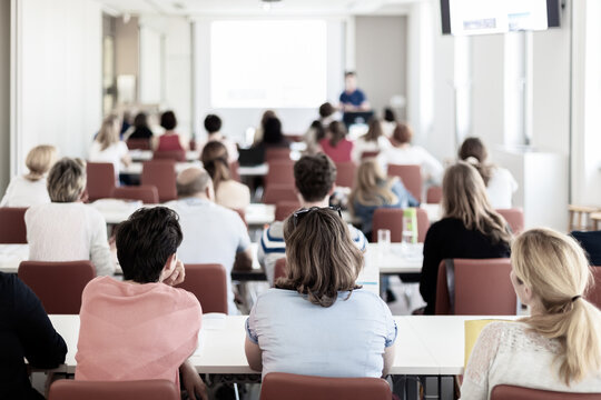 Speaker lecturing in lecture hall at university. Students listening to lecture and making notes.
