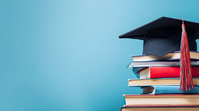 Graduation cap and stacked books on blue background symbolizing education and achievement, web banner with copy space on right side.