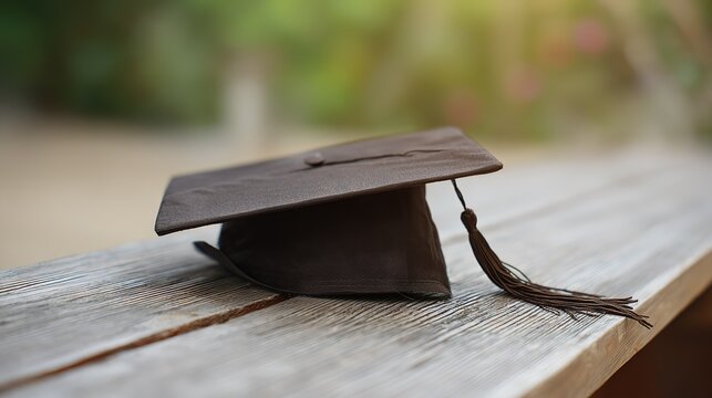 Single graduation cap with tassel detail placed on wooden surface in soft window light, shallow depth of field, warm academic and education success concept