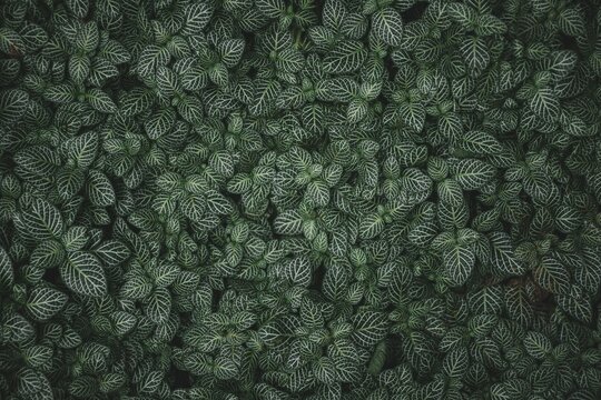 Top view of tropical 'Ruellia Devosiana' plant with narrow leaves with white veins