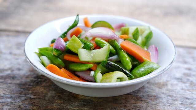Bowl of Asinan, acar timun or jelatah are preserved tropical fruits and vegetables, carrot, cucumber