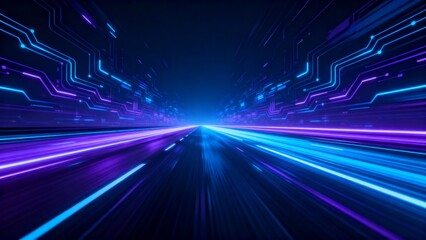Technology speed motion concept panoramic high speed futuristic abstract background with dynamic light on road featuring neon blue purple glow conveying digital energy innovation virtual space and acc